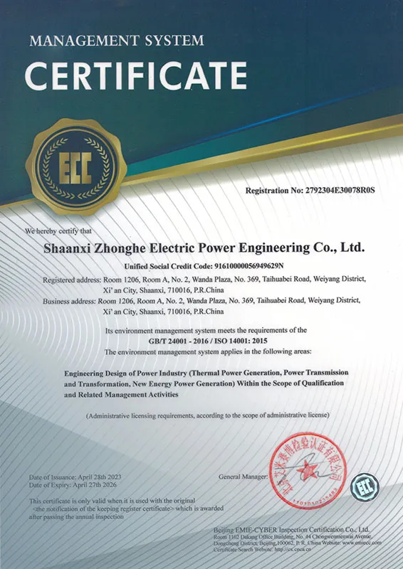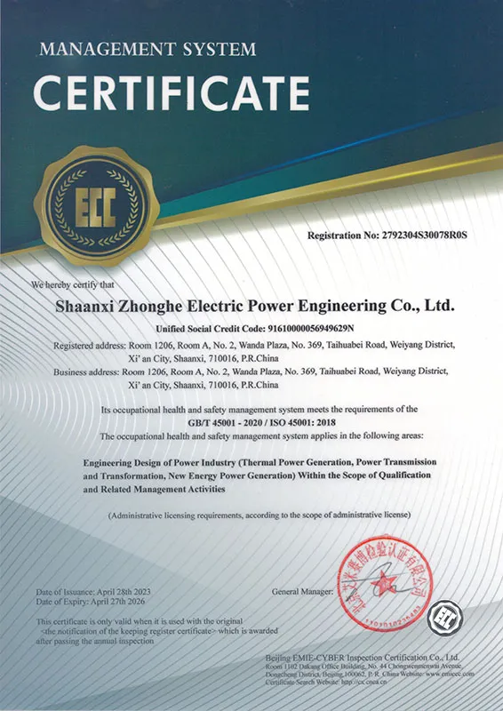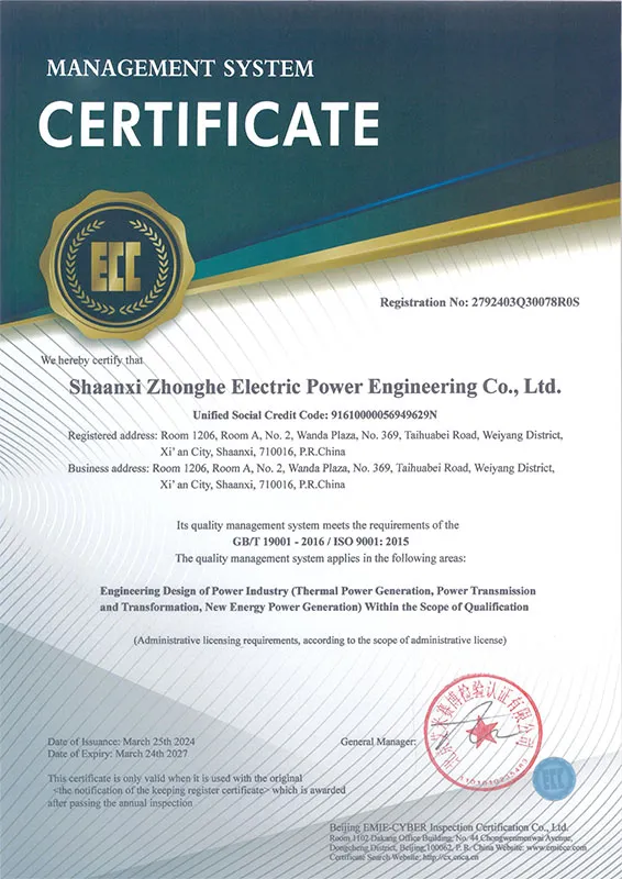 ООО Шэньси Чжунхэ Электроэнергетическая Инжиниринговая была основана в 2012 году и расположена в городе Сиань провинции Шэньси, всемирно известной культурной столице. С момента своего основания Шэньси Чжунхэ Электроэнергетическая Инжиниринговая унаследовала высочайший уровень национального энергетического проектирования и технического стиля. Используя первоклассные технологии и добросовестное обслуживание в качестве своих основных конкурентных преимуществ, компания специализируется на планировании и проектировании энергосистем, реконструкции и проектировании крупных и средних тепловых электростанций, передаче и преобразовании энергии, проектировании проектов возобновляемой энергетики, генеральном подряде, управлении проектами и консалтинговых услугах.